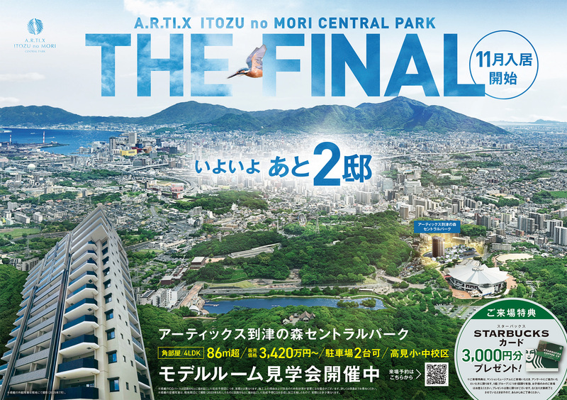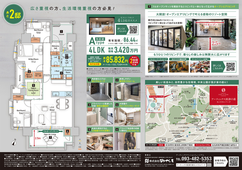 【物件概要】●名称/アーティックス到津の森セントラルパーク ●所在地(地名地番)/北九州市小倉北区上到津4丁目1988番2●交通/西鉄「北九州市立総合体育館」バス停 徒歩約1分(約50m)●用途地域/第1種住居地域 ●地目/宅地 ●建ぺい率/60% ●容積率/200% ●私道負担/なし ●敷地面積/2,388.99㎡ ●建築面積/475.23㎡ ●延床面積/4,950.17㎡ ●構造・規模/鉄筋コンクリート造 地上14階建 ●総戸数/52戸 ●駐車場/79台 ●バイク置場/5台 ●自転車置場/48台 ●竣工予定/2025年10月末 ●入居予定/2025年11月下旬 ●設計・監理/株式会社スズキ設計 ●施工/福屋建設株式会社 ●分譲後の権利形態/(敷地)専有面積割合による所有権の共有(建物)専有部分は区分所有権、共用部分は専有面積割合による所有権の共有 ●管理形態/全区分所有者にて管理組合を結成後、管理会社へ管理委託 ●管理員の勤務形態/未定 ●建築確認番号/第BVJ-FUK23-10-0440号(令和5年10月12日) ●売主/株式会社なかやしき ●管理会社/株式会社なかやしき エステートソリューション事業部 【第3期物件概要】●販売戸数/3戸 ●販売価格/3,420万円〜3,890万円 ●最多販売価格帯/3,800万円台(2戸) ●間取り/4LDK ●住戸専有面積/86.44㎡~88.14㎡ ●バルコニー面積/22.82㎡~26.22㎡ ●アルコーブ面積/7.73㎡●管理費/8,650円〜8,820円 ●修繕積立金/7,780円〜7.940円 ●修繕積立基金(一括)/466,800円〜476,400円 ●駐車場使用料(月額)/8,000円〜14,000円 ●バイク置場使用料(月額)/1,000円