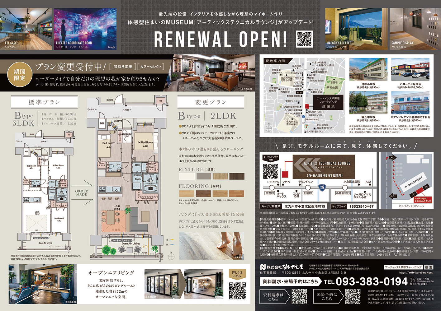 ●名称/アーティックス黒原フォートガルデ ●所在地/福岡県北九州市小倉北区黒原二丁目115-1、他2筆(地番) ●交通/西鉄「黒原一丁目」バス停 徒歩約2分(約85m) ●総戸数/38戸 ●構造・規模/鉄筋コンクリート造地上14階 ●敷地面積/1,441.73㎡ ●建築面積/435.28㎡ ●建築延床面積/3,452.36㎡ ●建築確認番号/第BVJ-FUK25-10-0181号(令和7年3月25日) ●用途面積/第2種住居地域、第1種中高層住居専用地域 ●完成予定年月/2026年10月下旬 ●入居予定年月/2026年12月上旬 ●駐車場/52台(平置き駐車場30台、機械式駐車場21台、来客用兼EV充電駐車場1台) ●駐車場料金(月額)/5,000円〜14,000円 ●駐輪場/32台 ●バイク置場/2台 ●バイク置場料金(月額)/1,500円 ●レンタル倉庫(月額)/4,000円 ●分譲後の権利形態/(敷地)専有面積割合による所有権の共有(建物)専有部分は区分所有権、共用部分は専有面積割合による所有権の共有 ●管理形態/全区分所有者にて管理組合を結成後、管理会社へ管理委託 ●管理会社/株式会社なかやしき エステートソリューション事業部 ●管理員の勤務形態/巡回 ●設計・管理/株式会社スズキ設計 ●施工/福屋建設株式会社